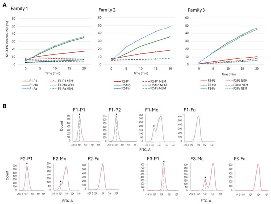 Flippase activity of RBCs of patients with ATP11C mutations and their relatives. (A) Proportion of fluorescent phosphatidylserine (NBD-PS) transported into the inner leaflet in patients and family members after 20 min incubation (MFI NBD-PS + BSA/MFI loaded NBD-PS, colored lines). Dotted lines represent blocked NBD-PS internalization after NEM treatment. Values are mean n = 2 experiments for each sample. (B) Primary NBD-derived fluorescence data from flow cytometry. NBD-PS loaded onto erythrocyte membranes for 20 min. Stars indicate the population of the NBD-PS transported defective cells. MFI: Mean fluorescence intensity; BSA: bovine serum albumin. NEM: mM N-ethylmaleimide; F1-P1: Family 1, Patient 1; F1-P2: Family 1, Patient 2; F1-Mo: Family 1, mother; F1-Fa: Family 1, father; F2-P1: Family 2, Patient 1; F2-Mo: Family 2, mother; F2-Fa: Family 2, father; F3-P1: Family 3, Patient 1; F3-Mo: Family 3, mother; F3-Fa: Family 3, father.