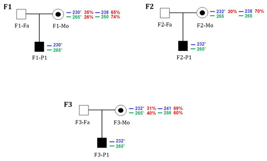 Chromosome X inactivation evaluation. The asterisk (*) indicates the X chromosome bearing the flippase variant. The percentage of X-inactivation for each allele is shown in red. The size of the AR allele is shown in blue, and the size of the ZMYM3 polymorphisms is shown in green. Symptomatic males are shaded in black. Black dots indicate the presence of the mutation in females. F2-Mo is not informative for the ZMYM3 allele.