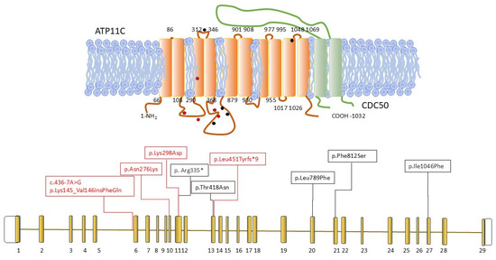 Linear schematic representation of the ATP11C gene and proteins (ATP11C, orange and CDC50, green). All the variants identified in this study and their positions are shown in the red boxes and circles. Variants reported in the literature as indicated in black.