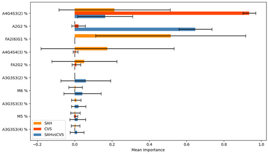 In the CVS model, the glycan A4G4S3(2) was assigned the highest importance with minimal variability, indicating a consistently strong predictive role. In the SAH model, FA2(6)G1 was identified as the most informative, although its higher standard deviation suggested less stable behavior. In the SAH vs. CVS comparison, A3G3S3(5) and A2G2 ranked among the top features, implying their relevance in capturing finer distinctions between the two disease states. A4G4S3(2) appeared prominently across all models, indicating its potential as a robust shared biomarker.