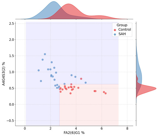 Figure 3 displays the joint distribution of the two most discriminative glycans in the SAH classification task—FA2(6)G1 and A4G4S3(2). Clear group-wise separation is observed: SAH patients tend to have lower FA2(6)G1 and higher A4G4S3(2) levels compared to healthy controls. The decision regions, derived directly from the tree structure, reveal a simple threshold-based rule involving both features, resulting in clearly separated prediction zones. Marginal histograms show the distribution of each feature individually by class.