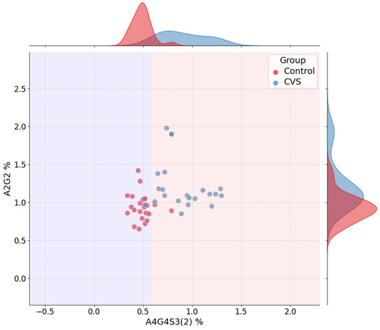 Jointplot for CVS vs. Control classification using A4G4S3(2) and A2G2. Marginal histograms and decision boundaries are shown.