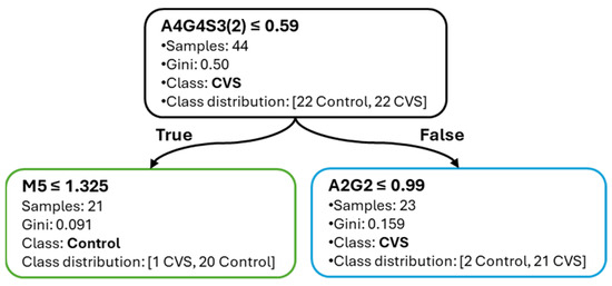 Figure 6 shows the corresponding decision tree for CVS classification. The root split occurs at A4G4S3(2) ≤ 0.59%, effectively partitioning the samples by disease state. Subsequent splits include M5 and A2G2, both of which support clinically relevant separation. As with the SAH model, the tree remains shallow and interpretable, emphasizing the explanatory clarity provided by the selected glycans.