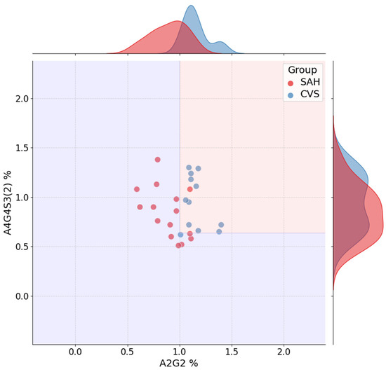 Figure 7 displays the jointplot for the SAH vs. CVS classification task, based on the top two features from the best-performing model: A2G2 and A4G4S3(2). The decision boundary, derived from the decision tree, separates the two groups along these axes, with marginal histograms indicating class-specific distribution shifts. Although the separation is less distinct than in previous comparisons, consistent group-level differences are apparent, and clinically relevant separation is still achieved.