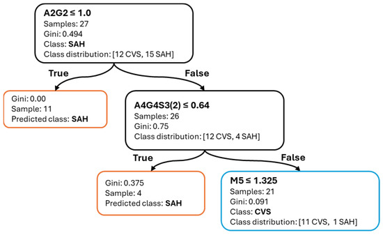 Figure 4 shows the corresponding decision tree trained on the full dataset for SAH classification. The first split is made on FA2(6)G1 (≤2.71%), effectively isolating a group of SAH patients. A secondary split on A4G4S3(2) (≤0.625%) completes the classification, resulting in terminal nodes with high purity. The shallow depth and small number of decision rules highlight the interpretability and diagnostic potential of these features.