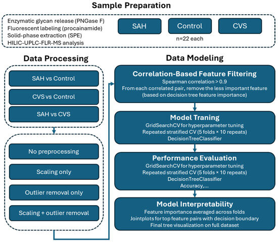 This study employed a structured pipeline to integrate high-resolution glycomics and decision tree-based classification for the differentiation of healthy controls, SAH patients, and patients with cerebral vasospasm. The methodological design emphasized transparency and reproducibility, aligning each analytical step with clinical interpretability. Although decision tree classifiers support multi-class problems, we intentionally applied binary classification models to answer specific clinical questions (e.g., early SAH detection, CVS risk stratification) while improving model robustness given the small group sizes. Binary classification also yielded simpler and more interpretable decision rules [14]. Key elements included enzymatic glycan release and fluorescent labeling, robust chromatographic analysis, and systematic data preprocessing strategies such as scaling, outlier filtering, and correlation-based feature pruning guided by model-derived feature importance. To ensure reliable evaluation, stratified train–test splitting and repeated cross-validation were implemented alongside comprehensive performance metrics.