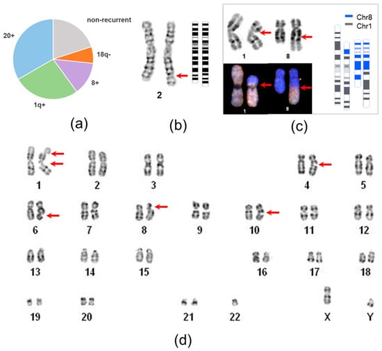 The most prevalent genetic alteration observed was the gain of 20q, which manifested as trisomy 20 (n = 3), isochromosome 20q, or pseudoisodicentric chromosome (Figure 2d,e). Notably, small duplications or amplifications at 20q11.21 were not detected, as they are beyond the resolution of karyotyping.