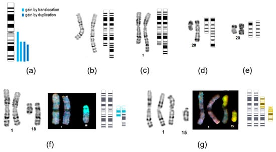 Structure of recurrent chromosomal rearrangements. (a) Chromosomal localization of 1q gains. (b–e) G-banded images of rearranged chromosomes and respective ideograms of lines: (b) P5Lmix, dup(1)(q23q44); (c) P16L2, dup(1)(q25q44), (d) P16L2, psu idic(20), and (e) MNA cl3, i(20q). (f,g) G-banding, spectral karyotyping, and graphical illustration of translocations in HAS cl38 and MAK-F lines. Ideograms were generated using the CyDAS web interface, the color code of ideograms corresponds to SKY staining of respective chromosomes.