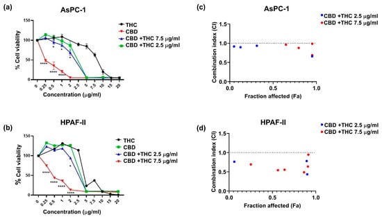 2.1. CBD and THC, in Combination, Decrease Pancreatic Cancer Cell Viability