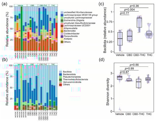 - Thu, M.S.; Campbell, B.J.; Hirankarn, N.; Nopsopon, T.; Ondee, T.; Hall, S.R.; Jagota, A.; Fothergill, J.L.; Pongpirul, K. Cannabis and cannabinoid-microbiome interactions in varied clinical contexts: A comprehensive systematic review. Biomed. Pharmacother. 2025, 182, 117764. [Google Scholar] [CrossRef]