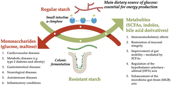 Comparison of regular and resistant starch in the human GI tract: Digestion vs. Fermentation. Schematic representation of the differential metabolic fates and health impacts of regular starch versus resistant starch. Regular starch is enzymatically hydrolyzed by α-amylase in the small intestine (indicated by the blue arrow), producing monosaccharides such as glucose and maltose, which are rapidly absorbed and utilized for energy production. However, excessive intake of rapidly digestible starches is associated with increased risk of chronic diseases, including cardiovascular, metabolic (e.g., type 2 diabetes, obesity), gastrointestinal, neurological, autoimmune, and other inflammatory conditions. In contrast, resistant starch bypasses digestion in the small intestine and reaches the colon intact, where it undergoes microbial fermentation. This process generates beneficial metabolites such as short-chain fatty acids (SCFAs), indoles, and bile acid derivatives, which exert multiple health-promoting effects. These include immunomodulatory activity, restoration of mucosal integrity, improved gut motility (mediated by SCFAs), regulation of the hypothalamic–pituitary–adrenal (HPA) axis, and enhancement of the microbiota–gut–brain (MGB) axis. Created in PresentationGO. Heghes S.C. (2025) https://PresentationGO.com (accessed on 8 July 2025).