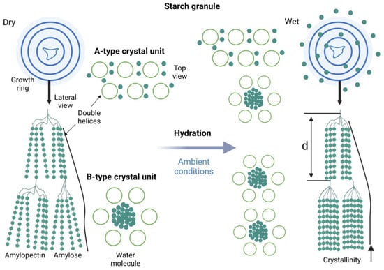 Structural organization and hydration-induced transformation of starch granules, highlighting A- and B-type crystalline units and their relevance to RS3 formation. Created in Biorender. Varvara R. (2025) https://app.biorender.com/illustrations/68947947011fb7309a7391c8 (accessed on 8 July 2025).