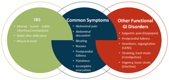 IBS manifests as a condition typified by abdominal discomfort or pain, abdominal distention, flatulence, and disturbances in intestinal transit. Despite these hallmark features, the diagnostic process for IBS is intricate due to clinical presentations that may overlap with signs and symptoms indicative of other gastrointestinal disorders, including functional dyspepsia, chronic constipation, bloating, distension, and/or gastroesophageal reflux disease (GERD) [91,92]. The intricate intersection of IBS symptoms with those of alternative gastrointestinal maladies is elucidated in Figure 3.