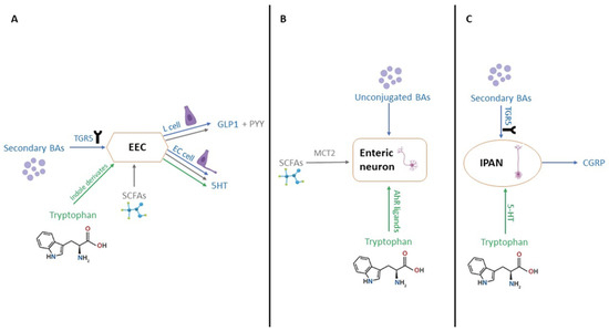 Microbial metabolites modulate gut motility and neuroendocrine signaling. (A) Effects of secondary bile acids, SCFAs, and tryptophan derivatives on EEC activity. (B) Direct activation of enteric neurons by SCFAs and AhR ligands. (C) TGR5-mediated signaling in IPANs via bile acids and serotonin. Created in Biorender. Varvara R. (2025) https://app.biorender.com/illustrations/689478238f728fcd8d876116 (accessed on 8 July 2025).