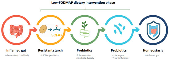 Irritable bowel syndrome (IBS) is a common functional gastrointestinal disorder with a very broad estimated prevalence (1.1–45.0%) due to a large methodological heterogeneity [1,2]. IBS exhibits a higher incidence in women [3]. Characterized by multifactorial etiology, IBS poses diagnostic and therapeutic challenges due to the absence of pathognomonic structural changes. Resistant starch (RS) is emerging as a multifunctional delivery system for bioactive metabolite generation through targeted microbiota fermentation. By promoting the site-specific production of postbiotics such as SCFAs, indoles, and neuroactive amines, RS influences gut–brain signaling, intestinal barrier function, and immune modulation—key pathways in irritable bowel syndrome (IBS) [4].