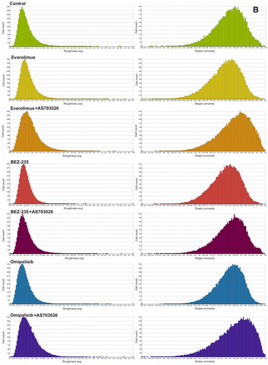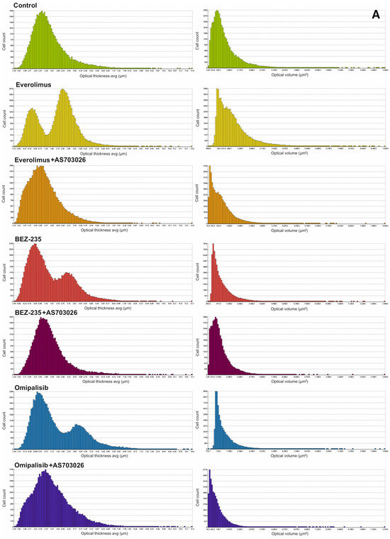 We studied the effect of mTOR kinase inhibitors Everolimus, BEZ-235, and Omipalisib, alone and in combination with MEK1/2 kinase inhibitor AS703026, on cell morphological parameters after 72 h of stimulation. We determined parameters such as optical thickness, optical volume, roughness, shape convergence, and irregularity cells.