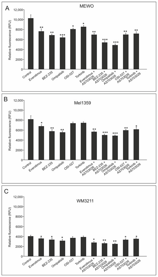The effect of mTOR inhibitors on in vitro cell invasion melanoma cell lines: MEWO (A), Mel-1359 (B), and WM3211 (C). Cell invasive capacity was assessed via a Matrigel-coated Boyden chamber assay. The accompanying histogram presents the quantification of invasive cells. Data are expressed as the mean ± standard deviation from four technical replicates across two independent experiments. Statistical comparisons were performed using one-way ANOVA followed by Tukey’s post hoc test (Statistica version 12, StatSoft). Levels of statistical significance are denoted as follows: (*) p < 0.05; (**) p < 0.01; (***) p < 0.001. The primary melanoma cell line WM3211 (VGP) has the lowest sensitivity to the applied inhibitors, at 7–22% (Figure 4C).