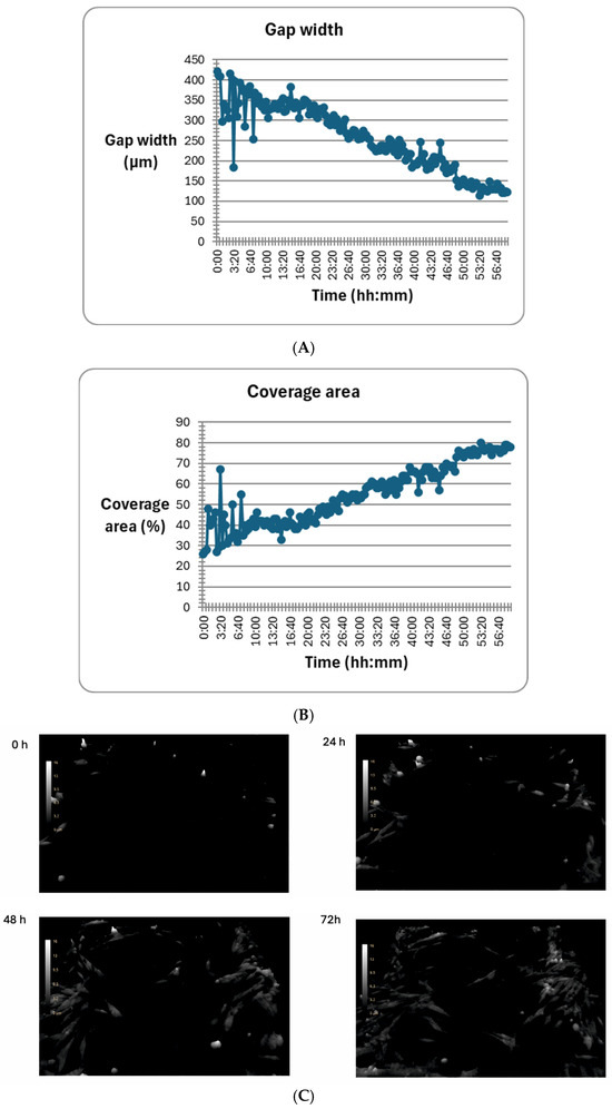 Figure 5 shows the dynamics of the gap width and coverage area process. Additionally, the process is illustrated by holographic photos taken at time intervals of up to 72 h (Figure 5).