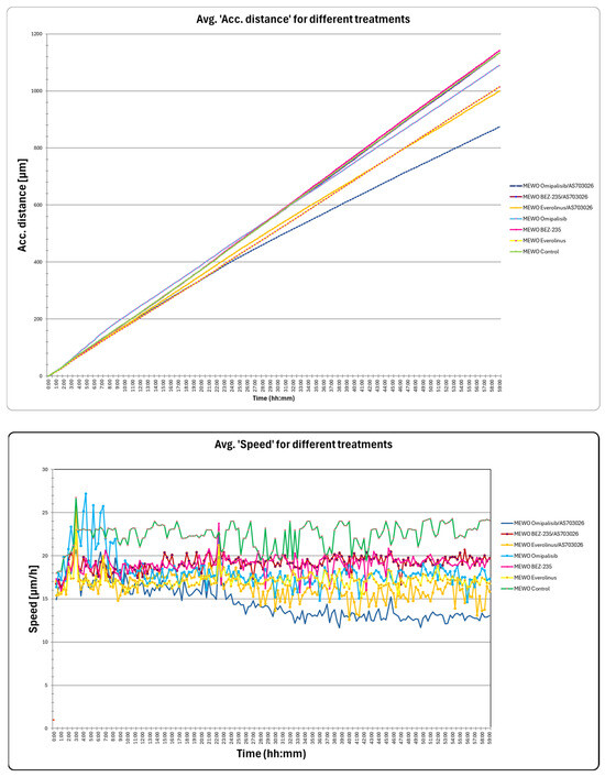 We observed a significant change in the distance and maximum speed of MEWO melanoma cells after treatment with mTOR and MEK1/2 kinase inhibitors (Figure 6). The most significant decreases in maximum speed and distance were observed after the use of Omipalisib and Everolimus inhibitors, and their combinations with the MEK1/2 kinase inhibitor AS703026 (Figure 6).