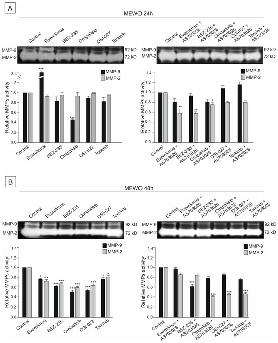 The effect of mTOR inhibitors (A) and the combination of mTOR inhibitors with the MEK1/2 inhibitor AS-703026 (B) on gelatinolytic activities of MMP-2 and MMP-9 in MEWO melanoma cell line. Statistical analyses of densitometric activity of MMP-2 and MMP-9 for at least three independent experiments with similar results were performed using one-way analysis of variance with Tukey’s post hoc test (Statistica 12.0 StatSoft); statistical significance at the level of (*) p < 0.05, (**) p < 0.01, (***) p < 0.001.