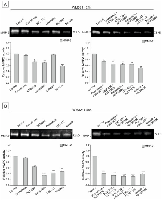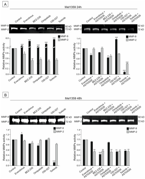 The effect of mTOR inhibitors (A) and the combination of mTOR inhibitors with the MEK1/2 inhibitor AS-703026 (B) on gelatinolytic activities of MMP-2 and MMP-9 in Mel-1359 melanoma cell line. Statistical analyses of densitometric activity of MMP-2 and MMP-9 for at least three independent experiments with similar results were performed using one-way analysis of variance with Tukey’s post hoc test (Statistica 12.0 StatSoft); statistical significance at the level of (*) p < 0.05, (**) p < 0.01, (***) p < 0.001.