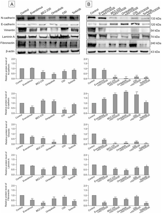 Baseline expression levels of N-cadherin and other cytoskeletal/ECM proteins were notably high in the untreated control group (Figure 10A,B). Upon treatment, dual PI3K/mTOR inhibitors demonstrated the most substantial downregulation of N-cadherin, with Omipalisib reducing its expression by approximately 50% (p < 0.001), and BEZ-235 by around 40% (p < 0.001). Other mTOR-targeting agents led to more moderate reductions in the 10–20% range. The addition of the MEK1/2 inhibitor AS-703026 significantly enhanced this effect across most treatment regimens, except for Everolimus.