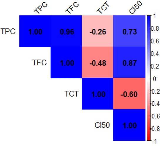 Correlation matrix of total phenolic content (TPC), total flavonoid content (TFC), total condensed tannins (TCT), and antioxidant activity (CI50) in Z. officinale and P. nigrum extracts. The axes (X and Y) represent the variables analyzed. The color scale to the right shows the strength and direction of correlations: blue indicates strong positive correlation (r ≈ +1), red indicates a strong negative correlation (r ≈ −1), and white indicates a weak or no correlation (r ≈ 0). Numerical values inside the cells correspond to Pearson correlation coefficients.