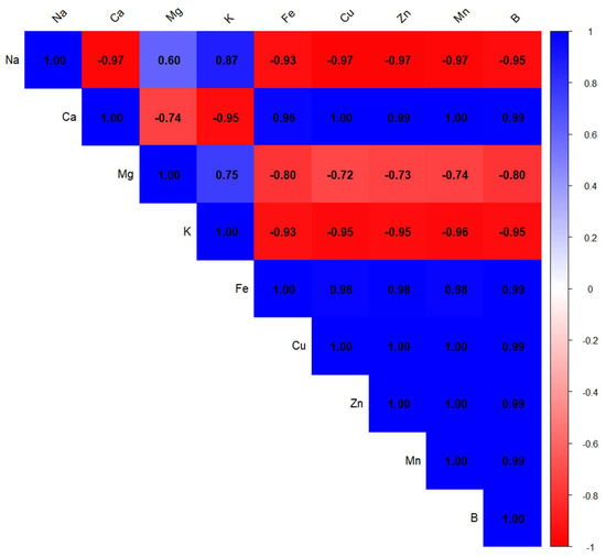 Correlation matrix of mineral composition in Z. officinale and P. nigrum extracts. The horizontal and vertical axes indicate the mineral variables included in the analysis. Each cell displays the Pearson correlation coefficient between two minerals. The color scale on the right represents the strength and direction of the correlation: blue indicates a strong positive correlation (r ≈ +1), red indicates a strong negative correlation (r ≈ −1), and white indicates a weak or no correlation (r ≈ 0).