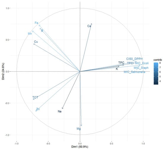 The plane defined by Dim1 (50.9%) and Dim2 (24.6%), together explaining 75.5% of the total variance, was used to represent the distribution of variables in the PCA biplot (Figure 3). The vectors illustrate the influence of each variable on the two principal components, with their coloration reflecting the strength of their contribution according to the “contrib” scale.