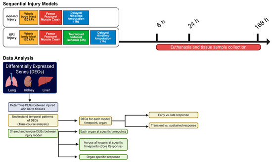 Experimental Strategy and Data Analysis Workflow. Schematic illustration of the research study approach, employing two polytraumatic injury models: a non-ischemia/reperfusion injury (non-IRI) model (whole-body blast, femur fracture/muscle crush, and delayed hindlimb amputation) and a tourniquet-induced ischemia/reperfusion injury (tIRI) model (incorporating tourniquet-induced ischemia before amputation). Tissue samples from the lung, kidney, and liver were collected at 6, 24, and 168 h post-injury. Differentially expressed gene (DEG) analysis was conducted to compare injury groups at each time point and to examine organ-specific and shared genes across time within and between the models. The analysis specifically aimed to identify upregulated genes shared by both injury conditions at the 6 h or 24 h time points, allowing for the differentiation between organ-specific and commonly shared genes. The schematic was created using the Bio-render web interface.
