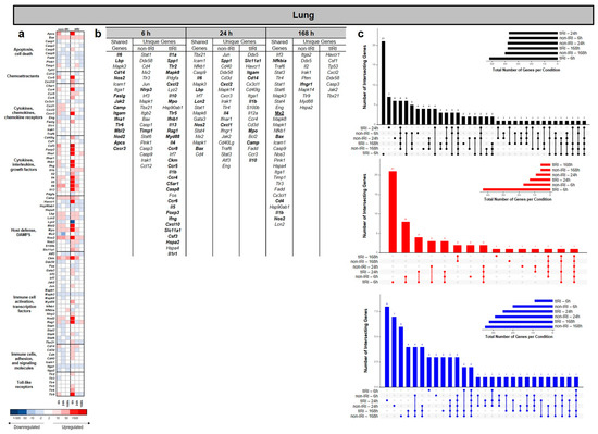 Temporal dynamics of lung gene expression following ischemic and non-ischemic polytrauma. Differentially expressed gene (DEG) analysis in lung tissue at 6, 24, and 168 h post-injury in the non-IRI and tIRI models: (a) Heatmap of the selected DEGs, clustered by biological pathway (red = upregulated; blue = downregulated). (b) The corresponding list of DEGs is provided, with the upregulated genes relative to naive lung tissue highlighted in bold. (c) Vertical UpSet plots summarize differentially expressed genes (DEGs) in the two trauma models across various post-injury time points, detailing the total, upregulated, and downregulated DEGs over time, with the horizontal bars on the inset graph indicating the total regulated genes per group at each time point. The plots also illustrate shared and unique DEGs between the time points, displaying the gene counts above columns and contributing time points listed below.