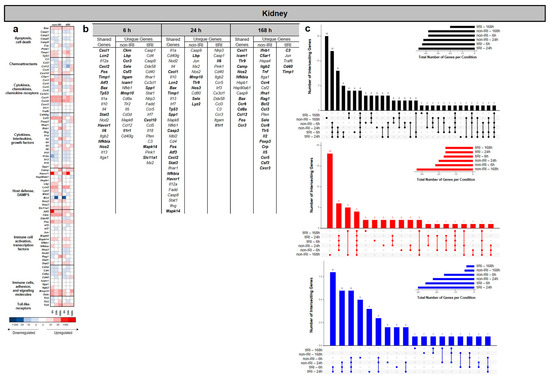 Kidney transcriptomic response to ischemic and non-ischemic polytrauma over time. Differentially expressed gene (DEG) analysis in kidney tissue at 6, 24, and 168 h post-injury in the non-IRI and tIRI models: (a) Heatmap of the selected DEGs, clustered by biological pathway (red = upregulated; blue = downregulated). (b) The corresponding list of DEGs is provided, with the upregulated genes relative to naive kidney tissue highlighted in bold. (c) Vertical UpSet plots summarize differentially expressed genes (DEGs) in the two trauma models across various post-injury time points, detailing the total, upregulated, and downregulated DEGs over time, with the horizontal bars on the inset graph indicating the total regulated genes per group at each time point. The plots also illustrate shared and unique DEGs between the time points, displaying the gene counts above columns and contributing time points listed below.