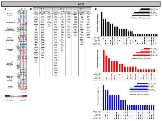 In contrast to the findings observed in the lung and kidney, the liver tissue from the nontIRI group showed the greatest number of significantly upregulated and downregulated genes at 24 hpi regulated genes across all the time points (Figure 4a–c), except where the number of upregulated genes in the tIRI group was modestly higher at 168 hpi (Figure 4c). While some DEGs were shared between models, many were uniquely regulated in each condition (Figure 4b,c). The heatmap and gene list analysis (Figure 4a,b) revealed that at 6 hpi, both injury models shared upregulation of genes involved in general inflammatory and immune responses, cell signaling (JAK/STAT and MAPK pathways), and innate immunity. These shared genes include Il1r1, Stat3, Mapk14, Lcn2, Stat6, Lyz2, Traf6, Jak2, Tlr7, Slc11a1, Tlr2, Cxcl1, and Mapk8. The non-IRI model uniquely upregulated a broader set of genes, including Havcr1, Irak1, Ifngr1, Stat1, Itgam, Nos2, Myd88, Tlr4, Timp1, Mapk3, Jun, Nfkb1, Stat4, and Atf3. This indicates a more diverse activation of immune pathways, encompassing additional pattern recognition receptors, interferon responses, and stress-inducible factors. In contrast, the tIRI model uniquely upregulated only Cxcl2, a potent neutrophil chemoattractant. This highly specific response suggests a more pronounced or targeted neutrophil recruitment driven by the ischemia/reperfusion component of the injury [19,20]. By 24 hpi, liver tissue gene expression revealed sustained shared upregulation of Il1r1, Cxcl1, and Ifngr1 in both models, indicating common inflammatory and chemokine signaling. Distinctly, the non-IRI model uniquely upregulated several genes involved in interferon and T-helper cell-mediated immunity (Il2, Ifnb1, Ifna1, Il23a, Ifng, and Il13), alongside cell adhesion (Icam1), suggesting a broad, ongoing adaptive immune response. In contrast, the tIRI model uniquely upregulated Il18 and Crp, highlighting a specific and potentially more severe pro-inflammatory and acute-phase response characteristic of significant tissue damage. At 168 hpi, both models showed distinct gene expression profiles. Shared upregulated genes, including Nfkbia, Jak2, Lcn2, Il6, Cxcl1, and Tlr6, indicated sustained common involvement in inflammation regulation, cytokine signaling, and innate immunity. The non-IRI model uniquely upregulated Ccl3, Tlr2, Gata3, Tlr4, Il5, Ifna1, Stat3, Il23a, and Mpo, pointing towards a persistent Th2- and innate immunity-driven response. Conversely, the tIRI model uniquely exhibited upregulation of Il1r1, Lbp, Ccr3, Ifng, and Cd40, suggesting a distinct, prolonged inflammatory and immune cell activation, potentially involving bacterial recognition and T-cell mediated processes.