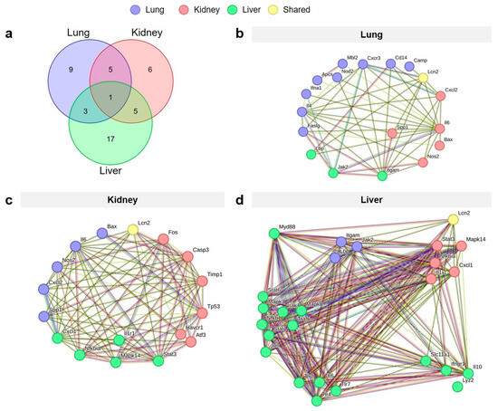Analysis of the upregulated genes across the lung, kidney, and liver tissues in both the non-IRI and tIRI groups revealed a complex interplay of shared inflammatory responses (Figure 5). A Venn diagram illustrates the number of upregulated genes unique to each organ and those shared between them at 6–24 hpi. Specifically, 9 genes were uniquely upregulated in the lung, 6 in the kidney, and 17 in the liver. Notably, one gene, Lcn2, was consistently upregulated across all three organs in both injury groups. Five genes (Cd14, Camp, Aoc1, Faslg, Bax) were shared between the lung and kidney. The lung and liver shared three genes: Il1b, Cxcl10, and Ptgs2. The kidney and liver shared five genes (Saa3, C3, Lbp, Hp, and Irf7). String gene network analysis of the shared upregulated genes in each organ highlights the potential associated functional relationships between genes and predicted protein–protein interaction.