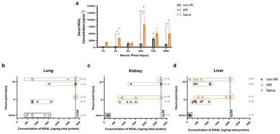As a next step in our investigation, circulating NGAL levels were measured at 1, 3, 6, 24, 72, and 168 hpi (Figure 6a). The tIRI cohort exhibited a significant and progressive increase in NGAL levels over the first 24 h, and remained significantly elevated at 168 hpi, highlighting the prolonged and sustained inflammatory mediator/LCN response from the tIRI over the nontIRI group. In contrast, the non-IRI cohort showed a delayed and attenuated NGAL elevation. Despite these differences, the NGAL levels remained significantly elevated in both cohorts at 168 h, with the tIRI group demonstrating higher concentrations.