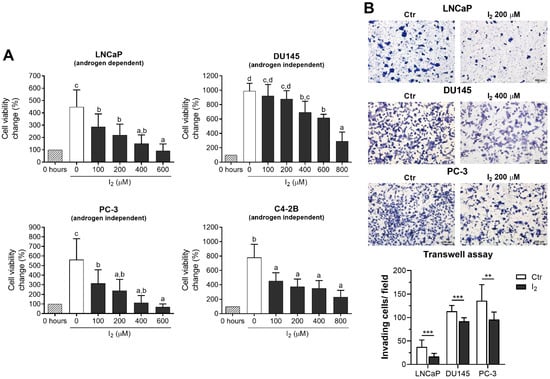 The effects of I2 on prostate cancer cell proliferation and invasive capacity. (A) LNCaP, DU145, PC-3, and C4-2B cells were cultured in increasing I2 concentrations. Cell viability was assessed at 96 h of treatments and was normalized against the initial cell population (0 h). (B) Representative micrographs and quantification of the invasion assay on prostate cancer cells pretreated with I2 for 48 h. Cell numbers were adjusted for the Transwell assays. Invading cells were dyed with toluidine blue and counted six hours later at 100× magnification. All data represent mean ± SD, n = 4–6 independent experiments in duplicate. Cell viability was analyzed with one-way ANOVA followed by Tukey post hoc tests. Statistical differences among groups are indicated with different letters (p < 0.05); groups that share the same letter are not significantly different. Transwell assays were analyzed with an unpaired t-test (** p < 0.01, *** p < 0.001).
