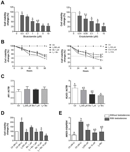 The effects of I2 and antiandrogens on LNCaP cells cultured in standard or androgen-stimulated conditions. (A) Dose-response effect of the androgen receptor antagonists bicalutamide (Bic) or enzalutamide (Enz) on cell viability at 96 h. (B) Time course and adjuvancy of the individual and combined effects of I2 and antiandrogens. (A,B) Cells were cultured for 96 h in standard 10% FBS supplemented medium, with I2 and/or Bic or Enz. Cell viability was normalized against its respective control. (C) Real-time PCR analysis of the androgen receptor (AR) and prostate-specific antigen (KLK3) expression in cells treated for 96 h. (D) Cell viability assays evidenced an adjuvancy of I2 and Bic in cells cultured with 10 nM of testosterone for 96 h. (E) The expression of androgen-responsive gene (NKX3-1) in LNCaP-treated cells for 48 h under androgen-stimulated conditions. n = 3–6 independent experiments in duplicate. All data represent mean ± SD. Statistical differences among groups are indicated with different letters (p < 0.05); groups that share the same letter are not significantly different.
