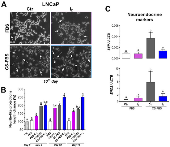 Cells were cultured for 3, 10, and 15 days in either standard (10% FBS) or androgen-deprived conditions (10% CS-FBS) with or without 200 µM I2. The NE phenotype was identified by the growth of neurite-like projections and the expression of NE markers such as SYP and ENO2. The length of neurite-like projections was assessed at different times (3, 10, and 15 days) using phase-contrast microscopy (OLYMPUS IX50; Center Valley, PA, USA) and ImageJ software (NeuronJ plugin, version 1.4.3). The length of these projections was expressed as a fold change regarding the basal length of the cell projections. Real-time PCR was used to analyze NE gene expression. In addition, neutral lipid accumulation (Oil Red O staining) was measured on the 10th day of treatments. DU145 cells served as a negative control for androgen signaling and were treated with 400 µM I2 for neutral lipid staining.