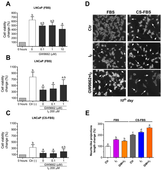 The participation of PPARG in I2 anti-proliferative effects and the growth of neurite-like projections. (A) Dose-response of the PPARG antagonist (GW9662) in LNCaP cells supplemented with fetal bovine serum (FBS) and treated for 96 h. (B,C) LNCaP cells supplemented either FBS or charcoal-stripped fetal bovine serum (CS-FBS) were treated with I2 and increasing doses of GW9662 for 96 h. Cell viability was normalized against the non-treated control group at 0 h. Data represent mean ± SD and were analyzed with a one-way ANOVA followed by a Tukey post hoc test; n = 3–4 independent experiments. (D) Representative micrographs of LNCaP cells treated for 10 days, highlighting the growth of neurite-like projections (arrows); 1 µM GW9662 was applied as indicated. Images were captured at 20× magnification using a bright-field microscope. (E) Comparison of the neurite-like projections in 10-day cultures. GW9662 is abbreviated as GW. Data represent mean ± SE and were analyzed with a one-way ANOVA followed by a Tukey post hoc test. n = 3 independent experiments. Different letters indicate statistical differences among groups (p < 0.05).