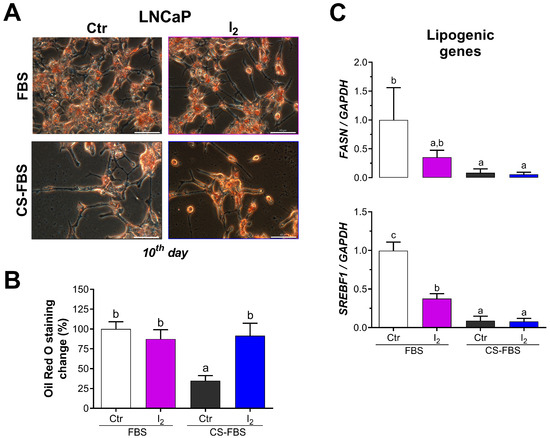 Lipogenic pathway analysis of iodine-treated LNCaP cells. Cells were cultured for ten days in standard or androgen depleted conditions with or without I2. Afterwards, cells were fixed and their intracellular neutral lipids analyzed with Oil Red O staining. (A) Representative micrograph of the stained cells. Notice that the lipids are primarily localized within the cell body and not in neurite-like projections. Scale bar: 40 μm. (B) Densitometric quantification of stained neutral lipids; n = 3, independent experiments. (C) Real-time PCR expression of the PPARG target genes fatty acid synthase (FASN) and sterol regulatory binding transcription factor (SREBF1) in LNCaP cells treated with 200 µM I2 for 48 h. All data represent mean ± SD and were analyzed with a one-way ANOVA followed by a Tukey post hoc test; n = 3–4 independent experiments. Statistical differences among groups are indicated with different letters (p < 0.05); groups that share the same letter are not significantly different.