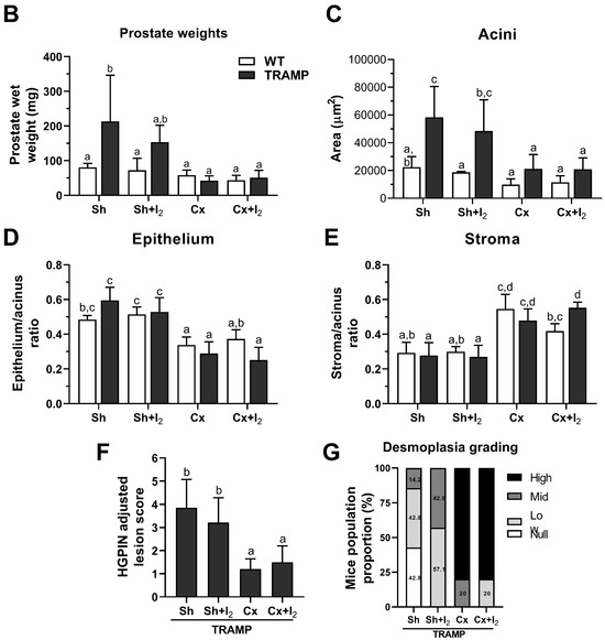 Quantitative analyses confirmed that TRAMP tumoral prostates had greater weights and acinar areas compared to those from WT mice (Figure 6B,C). Castration did not alter the prostate wet weight or acinar areas in WT mice; however, it decreased both parameters in TRAMP mice. In both groups, castration reduced the epithelium/acinus ratio (Figure 6D) and increased the stroma/acinus ratio (Figure 6E). As expected, castration also decreased the score of HGPIN lesions in TRAMP mice (Figure 6F) and raised the proportion of mice with higher desmoplasia grading (Figure 6G). Conversely, I2 administration increased the percentage and grade of desmoplasia in Sh-TRAMP mice (Figure 6G) but had no effect on most of the other histopathological parameters assessed in this study (Figure 6B–G).