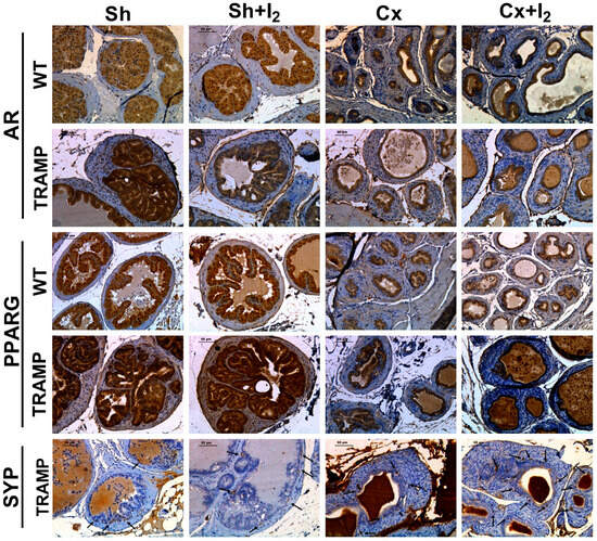 I2 was added to the drinking water (0.025% final concentration) and administered for four weeks to 18-week-old mice. The following four groups for WT or TRAMP mice were formed: Sh (sham), Sh + I2, Cx (castrated), and Cx + I2. Four weeks later, the 22-week-old mice were euthanized, and both normal and cancerous prostates were processed for histopathological (hematoxylin–eosin and Masson’s trichrome) or immunohistochemical analysis of SYP, AR, and PPARG.