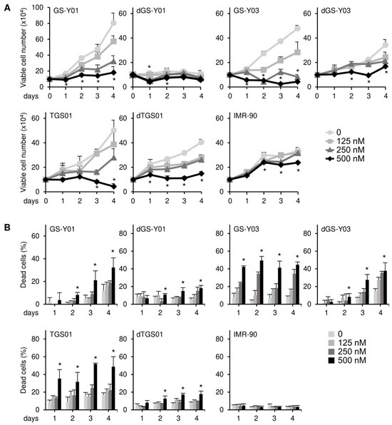 Domatinostat preferentially inhibits cell growth and induces cell death in glioma stem cells. (A) GS-Y01, GS-Y03, TGS01, their differentiated counterparts (dGS-Y01, dGS-Y03, and dTGS01), and IMR-90 human lung fibroblasts were treated with the indicated concentrations of domatinostat for 1–4 days, and the number of viable cells was assessed by trypan blue dye exclusion. (B) Cells were treated as in (A), and the percentage of dead cells was evaluated using the trypan blue dye exclusion assay. * p < 0.05 vs. treatment without domatinostat (i.e., at 0 nM).