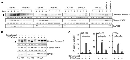 Domatinostat induces apoptotic cell death. (A) GS-Y01, GS-Y03, TGS01, their differentiated counterparts (dGS-Y01, dGS-Y03, and dTGS01), and IMR-90 human lung fibroblasts were treated without or with 500 nM domatinostat for 1–3 days, and were then subjected to Western blot analyses of the indicated proteins. The numbers below the images represent the means (n = 2) of the relative band intensities after each band was quantified by densitometry and normalized to the GAPDH value. * p < 0.05 vs. cells before domatinostat treatment (i.e., cells at 0 days) for each of the glioma stem cell lines and their differentiated counterparts, except for the right most panel where comparisons were made with the adjacent left lane (i.e., IMR-90 treated with domatinostat for 3 days). (B) Cells were treated without or with 500 nM domatinostat in the absence or presence of 40 μM Z-VAD-fmk for 1 day, and were then subjected to Western blot analyses of the indicated proteins. * p < 0.05 vs. cells treated with domatinostat alone. (C) Cells were treated as in (B), and were then subjected to the propidium iodide (PI) incorporation assay to assess the percentage of dead cells. * p < 0.05. In (A,B), the expected migrating position for cleaved caspase-3 is indicated by an arrow.