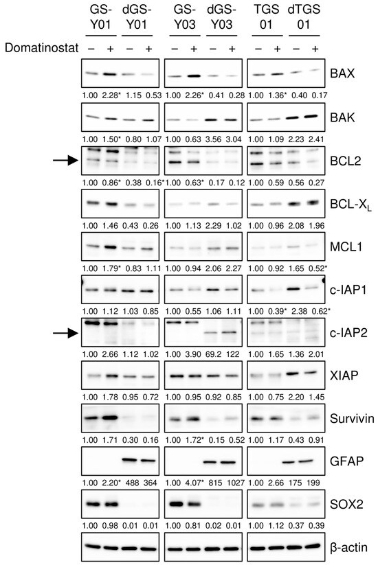 Domatinostat increases BAX expression selectively in glioma stem cells. The indicated glioma stem cells and their differentiated counterparts were treated without or with 500 nM domatinostat for 1 day, and were then subjected to Western blot analyses of the indicated proteins. The expected migrating positions for BCL2 and c-IAP2 are indicated by arrows. The numbers below the images represent the means (n = 2) of the relative band intensities after each band was quantified by densitometry and normalized to the β-actin value. * p < 0.05 vs. cells treated without domatinostat for each of the glioma stem cell lines and their differentiated counterparts.
