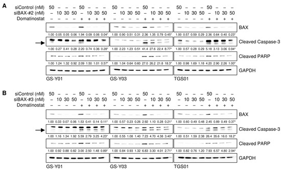 The incremental inhibition of BAX attenuates domatinostat-induced caspase activation. (A,B) Cells were transiently transfected with a control RNA (siControl) or an siRNA against BAX (siBAX-#2 in (A) and siBAX-#3 in (B)) at the indicated concentrations. One day after transfection, cells were treated without or with 500 nM domatinostat for one day, and were then subjected to Western blot analyses of the indicated proteins. The expected migrating positions for cleaved caspase-3 are indicated by arrows. The numbers below the images represent the means (n = 2) of the relative band intensities after each band was quantified by densitometry and normalized to the GAPDH value. * p < 0.05 vs. cells transfected with siControl and treated with domatinostat.