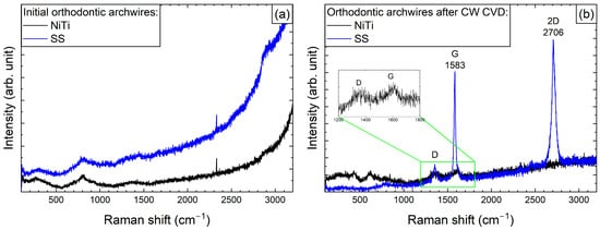 Before depositing graphene, we systematically recorded the Raman spectra of all samples in order to assess any structural changes that occurred during the process. Figure 1a shows the Raman spectra of the initial archwires made of steel and NiTi. Notably, even in the initial samples, we detected a few broad peaks in the range from 200 to 800 cm−1, which can be related to α-Fe2O3 and Fe3O4 []. The similarity in the shape and position of the peaks in the Raman spectra may be due to the presence of a rutile component with Eg and A1g symmetry in the NiTi samples, with positions at 230, 440, and 610 cm−1 [].