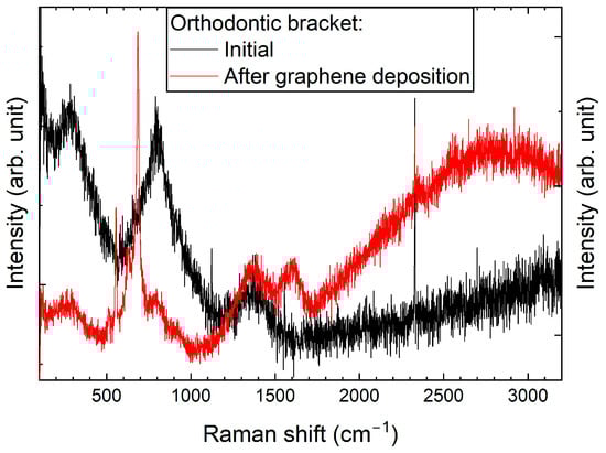 Similar to the archwires, Raman spectra for brackets were recorded before and after the graphene deposition process (Figure 2). Changes observed within the 100–1000 cm−1 range may indicate alterations to the surface structure of the bracket material. Specifically, these changes could suggest the oxidation of elements—primarily metals—that are components of the brackets, or the formation of new metal–carbon composites. Alongside the part of the spectrum where changes related to graphene formation were anticipated, only carbide formation was observed. This may represent an initial step towards developing a graphene layer. Nevertheless, the presence of a graphite-like layer in these samples could significantly enhance their properties.