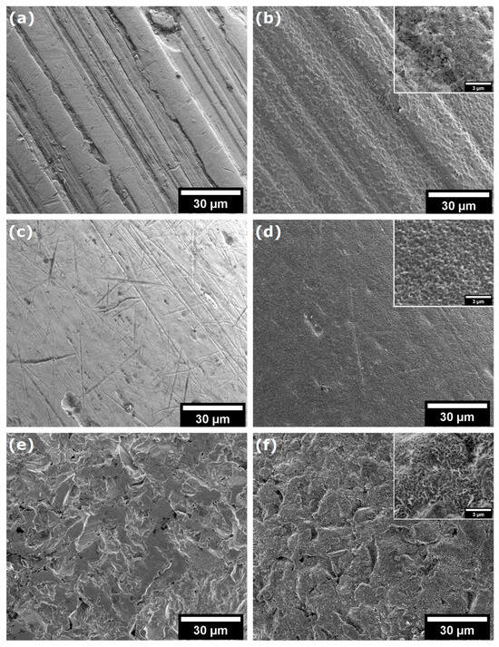 SEM analysis of archwires surfaces: (a) initial wires, (b) initial wires after CVD, (c) initial NiTi, (d) initial NiTi after CVD (NiTi-CW-CVD), (e) initial brackets, and (f) initial brackets after CVD.