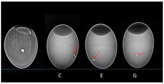 X-rays of the egg were taken in lateral and oblique planes. In each case, once the implant was inserted into the egg—whether into the yolk or the amniotic membrane—the X-ray images showed that embryonic development was unaffected. The implants did not move. Once all the contents had been removed from the egg, the amniotic fluid and omentum were found to be clear and the correct colour. The metal bracket and archwires in the yolk sac did not induce opacities or disorders related to angiogenesis (see Figure 4).